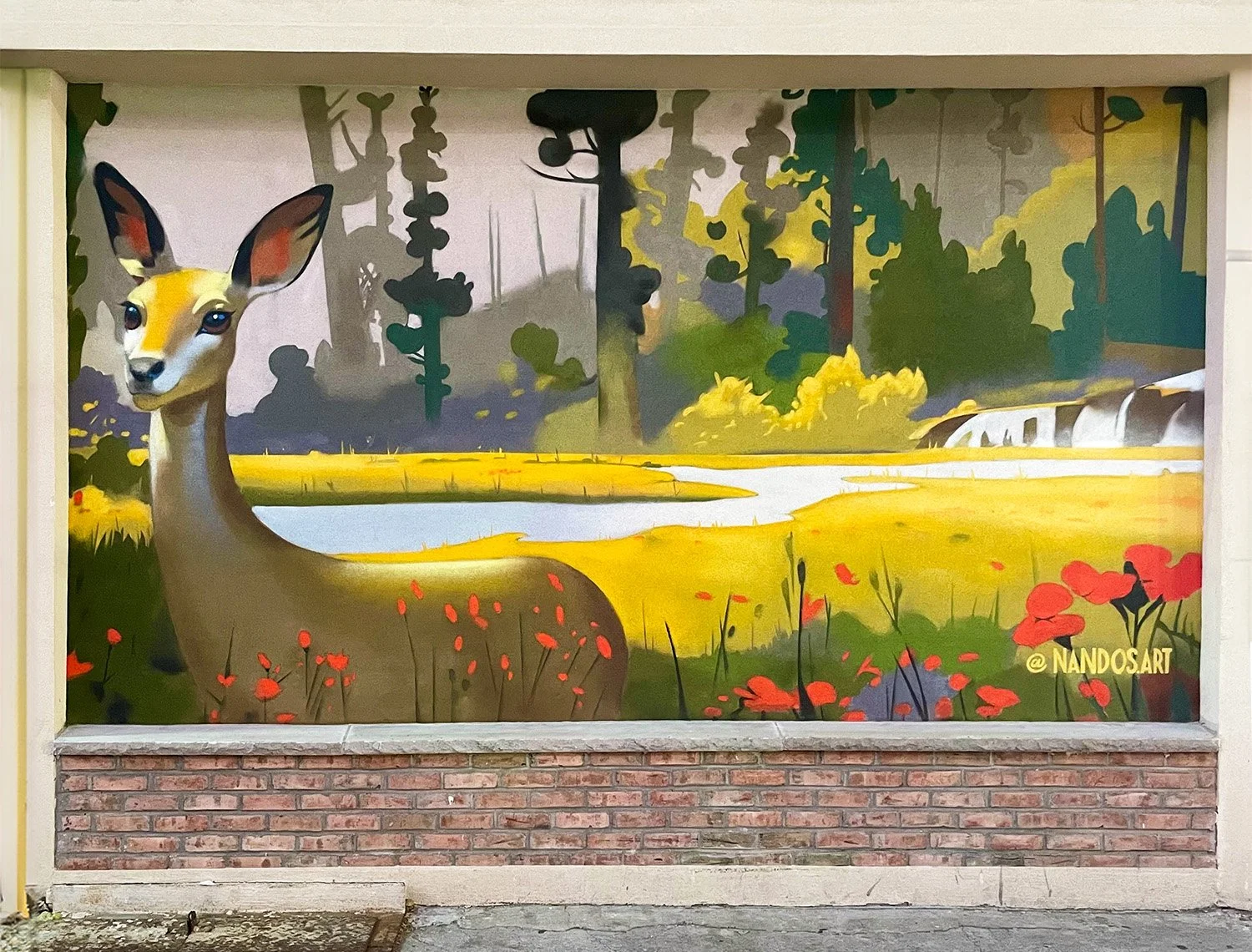 In October 2024, I painted this spray-painted mural as the second part of a nature-themed series for Key Food Supermarket in Astoria, Queens. The composition emphasizes a realistic rendering of the deer in the foreground, contrasted by a more stylized, flat-shape background. The warm palette and bold forms create a tranquil yet striking scene, continuing the theme of nature as a refuge within the city.